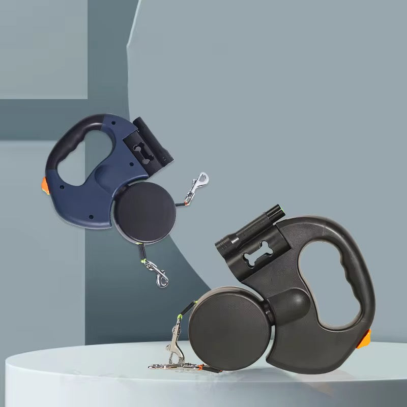 This leash is designed for small dogs under 8 kg. It includes a dual retractable leash system, ensuring no tangles while walking two dogs simultaneously. Each dog has its own independent braking system for control. The leash is adjustable at 3 meters, made from ABS, nylon rope, and chrome-plated metal. It measures 20*19 * 4CM.